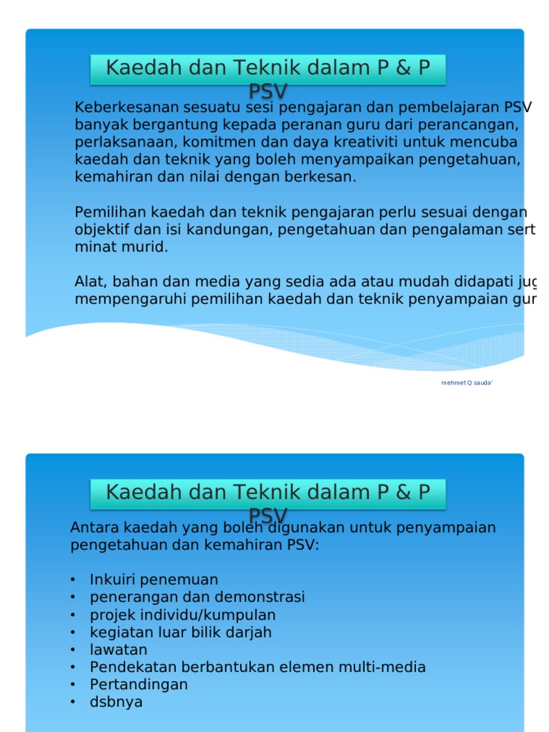 Guru perlu memilih kaedah dan teknik pengajaran yang sesuai agar penyampaian input kepada pelajar akan menarik dan bermakna. Melalui pengalaman yang lepas penggunaan media dalam proses pengajaran dan pembelajaran perlu dilakukan dengan berhemah untuk pemilihan kesesuaian media dengan pengajaran. Kaedah pengajaran merupakan cara yang digunakan untuk mengelola dan menggunakan teknik isi pelajaran dan alat bantu mengajar untuk mencapai objektif pengajaranTeknik pengajaran pula ialah kemahiran atau caramelaksanakan penyampaian bahan pengajaran kepada murid dari segi langkah-langkah dalam aktiviti pembelajaranSecara khususnya teknik merupakan satu cara penyampaian.