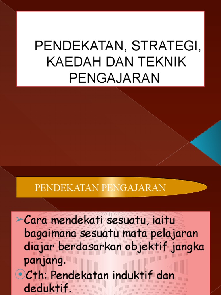 APA DIA PENDEKATAN KAEDAH TEKNIK DAN STRATEGI PENGAJARAN. 7-10 strategi pengajaran dapat dilaksanakan melalui beberapa pendekatan iaitu pendekatan yang berpusatkan murid kepelbagaian teknik kepelbagaian sumber bahan penggunaan tatabahasa yang tepat pengajaran yang bertema penyerapan bacaan luas penggabungjalinan penilaian pemulihan dan pengayaan.