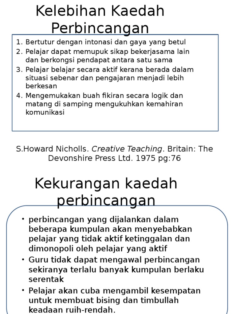 2 Tidak boleh kerana ia adalah bahan yang licin. 1Kaedah Penceritaan 2Kaedah Inkuiri 3Kaedah Perbincangan 4Kaedah Syarahan 5Kaedah Dapatan 6Kaedah Sokratik 7Kaedah Penerangan 8Kaedah Simulasi 9Kaedah Kaji Peta 10Kaedah Kaji Gambar 11Kaedah Kaji Dokumen 12Kaedah Tutorial 13Kaedah Tunjuk Cara 14Kaedah Kaji Buku Teks 15Kaedah. Menghuraikan ciri-ciri utama dan langkah-langkah pelaksanaan pelbagai kaedah dan teknik pengajaran.