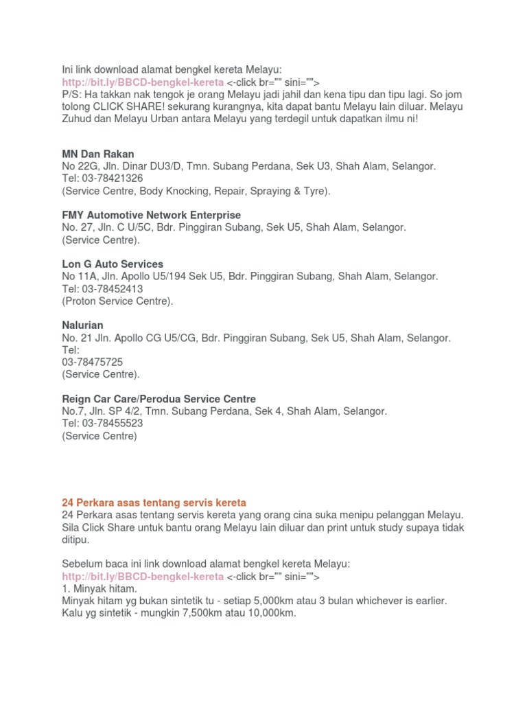 Bengkel Melayu List Servis Kereta Pdf