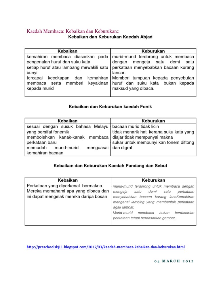 Guru digalakkan untuk memvariasikan teknik dan kaedah pengajaran yang menarik agar dapat mencapai objektif yang telah ditetapkan. Menurut Yahya Othman 2004 pendekatan ini meliputi aktiviti membaca beberapa kemahiran membaca yang biasa pada situasi membaca yang pelbagai seperti bagi tujuan rekreasi mencari maklumat dan bimbingan. Wahai cikgu-cikgu yang masih menggunakan Kaedah Mengeja Kaedah Sukukatasebut terus atau Kaedah Pasembor anda 1.