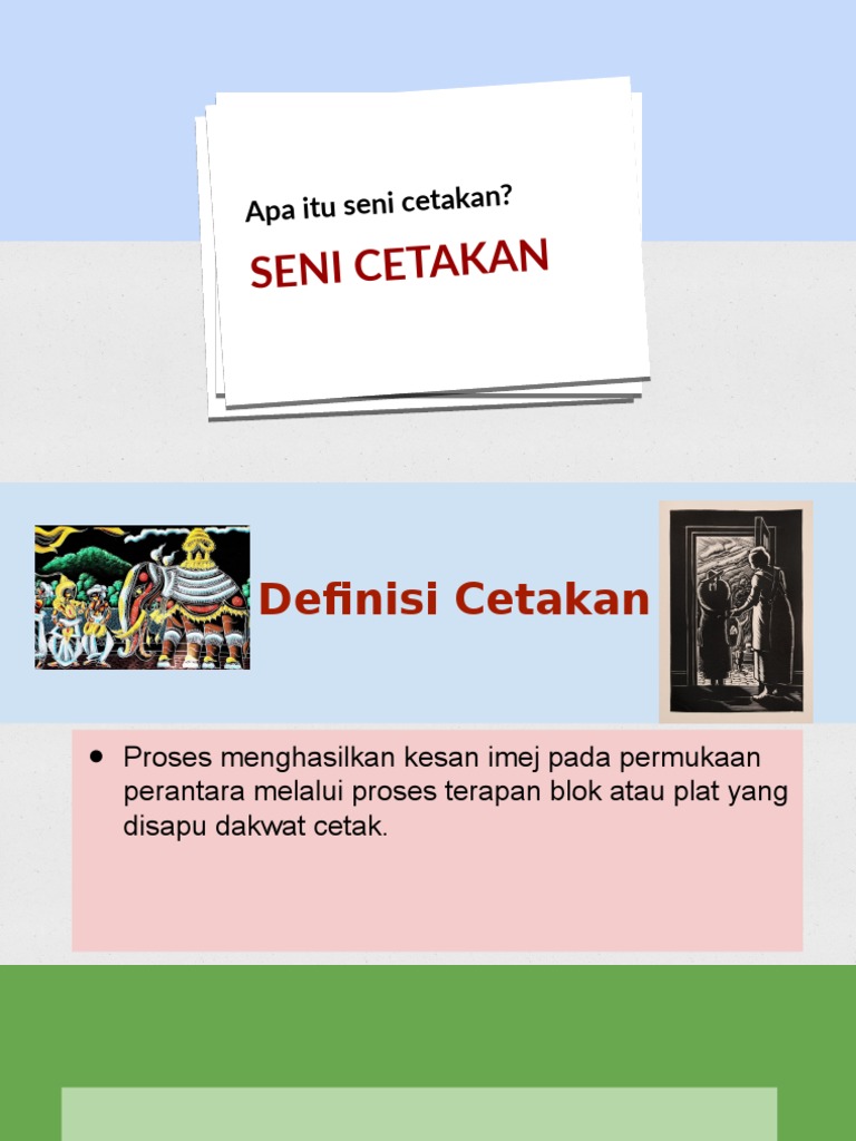 Sebelum dan selepas kemerdekaan Contoh Kaedah dan Teknik Seni Cetakan - Timbulan Relief - Benaman Intaglio - Permukaan Planografi - Sutera Saring Cadangan Aktiviti. Seni cetakan tempataan sangat rancak berkembang setanding Seni catan. Kaedah litografi dapat menghasilkan cetakan yang hamper sama seperti lukisan pensel.