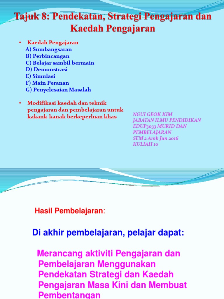 Dengan perkataan lainkedah pengajaran ialah cara mendekati sesuatu objektif pelajaran dengan langkah-langkah penyampaian. KAEDAH TEKNIK PENGAJARAN Kaedah pengajaran. Proses pengajaran dan pembelajaran mestilah berupaya menggalakkan murid menggunakan sebanyak mugkin kemampuan kreatif Dalam menghuraikan bahasa kaedah ii menggunakan aplikasi tatabahasa transformasi -generatif.