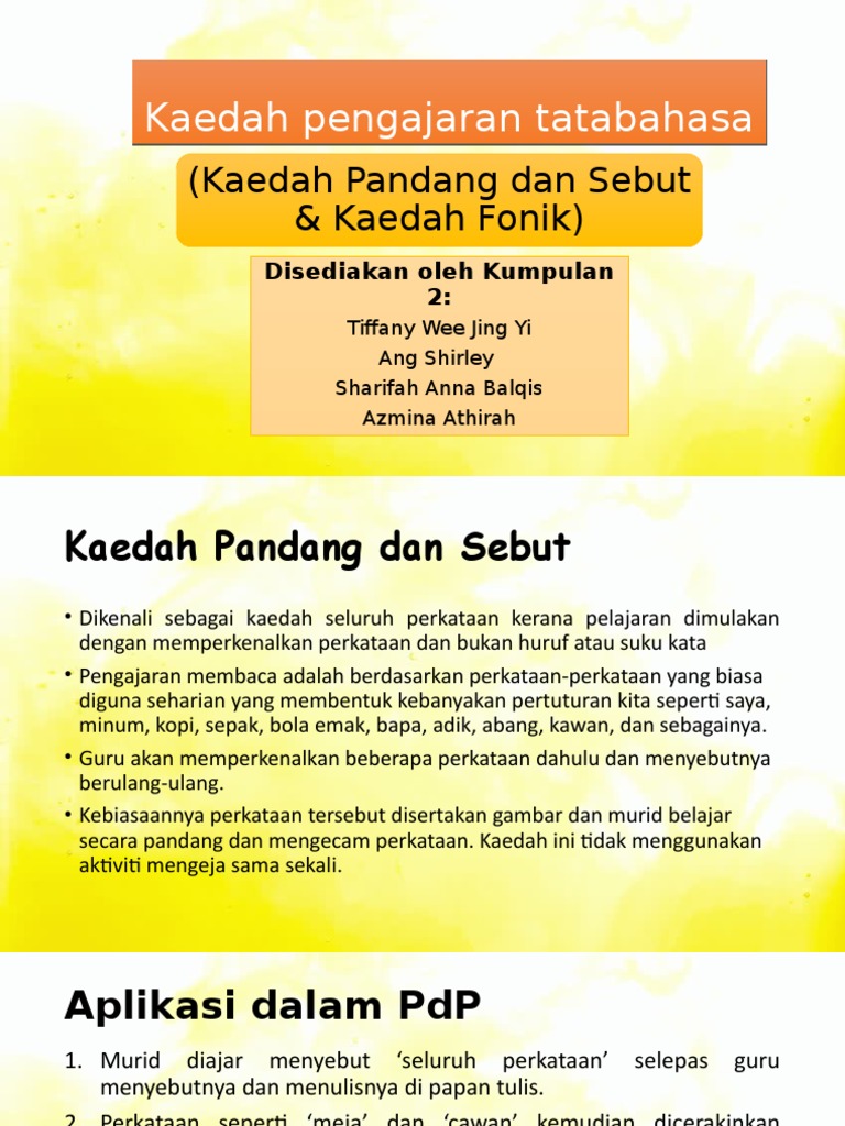Menghuraikan ciri-ciri utama dan langkah-langkah pelaksanaan pelbagai kaedah dan teknik pengajaran. Kaedah pengajaran dan pembelajaran yang pelbagai dapat meningkatkan minat murid terhadap sains. Cara mudah untuk mengenal kaedah fonik adalah membunyikan huruf TANPA MENYEBUT HURUF.